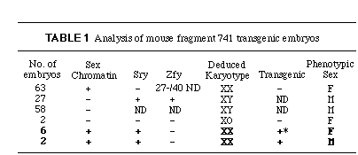 The ability of human SRY to cause sex reversal was assessed in animals representing three independent integrations of the transgene. Two of these were lines derived from XY founder transgenics, hA6 and hA9. These founders transmitted SRY to about half of their offspring: 8 out of 17 hA6 and 13 out of 36 hA9 embryos assayed were transgenic. We analysed progeny of these lines at 14.5 d.p.c., and found no evidence of testis-cord formation in XX transgenic fetuses, demonstrating that neither of the integrations in these lines could cause sex reversal. A third integration was represented by a single XX transgenic founder embryo; this too was phenotypically female.