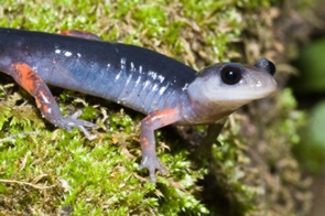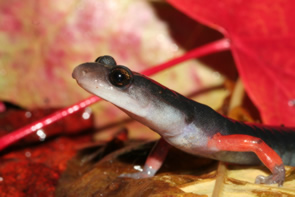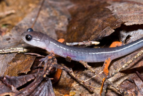 Description: These two species were formerly considered subspecies of the Jordan’s salamander (Plethodon jordani). Both of these species have dark grey bodies with lighter grey cheek patches and are easily identified by their red legs. Some individuals may have brassy flecking on the back. Some ocoee salamanders (Desmognathus ocoee) may have red legs but will also have a light line from the eye to the back of the jaw. Unlike red-legged salamanders, the back legs of the ocoee salamander are also much stockier than the front legs.