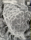 Eyeful. Eye produced on a fruit fly's wing by a squid gene (A) resembles one produced by a mouse gene (B).