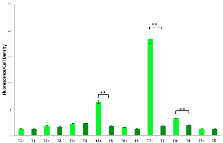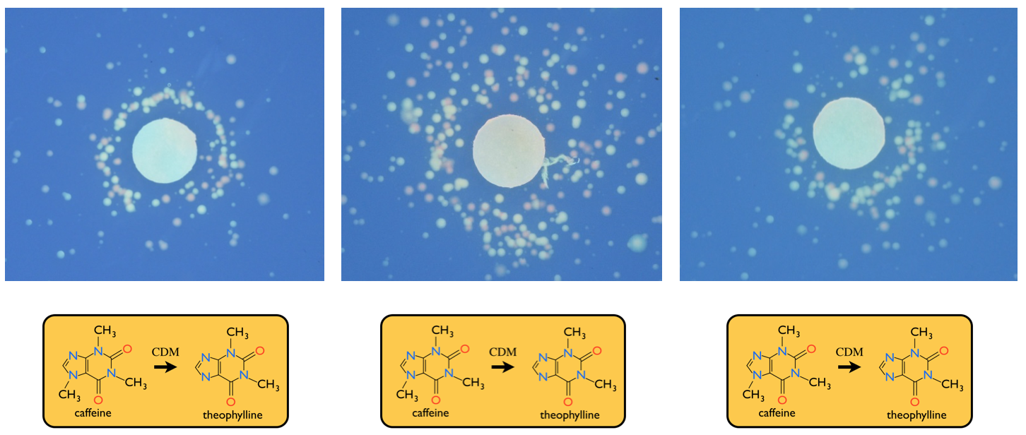 Above: Combined teams of summer students from both campuses. Below: Screen shot of a figure from the 2015 Programmed Evolution paper showing how cells identified genetic constructs that produced the optimal amount of theophylline from caffeine as a substrate.