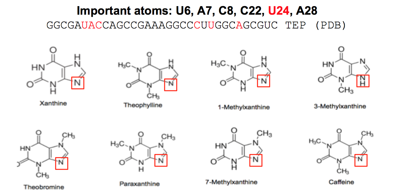 Above: Summer 2015 Davidson College research students. Below: Screen shot from PPT presentation where students discussed the six target bases in the theophylline (TEP) aptamer. These six bases are the key to this RNA aptamer binding to theophylline and they wanted to mutate the bases in order to find a new sequence that could either bind theophylline or one of the other seven members of the xanthine family.