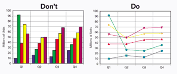 USE ONLY ELEMENTS THAT MAKE THE POINT: Bar graphs (left) some times are a no-no because they emphasize the size of the columns, whereas the only point that's important is the top of the bar. A Cleveland dot graph (right) might be a better choice especially for a time series. Bar graphs can be good for single time points.