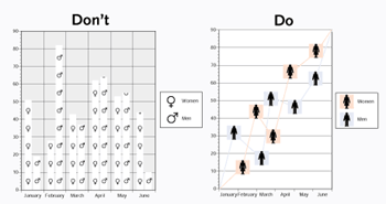 SIMILARITY AND SIZE AFFECT THE MESSAGE: Choose your icons carefully. Scientists often use the sex symbols in graphs meant to show the differences between men and women (left), for instance. Yet they are not easily discernible with a quick glance. Choose a more dissimilar icon (right). Also, size is a powerful signifier of importance. If your icons are too small (left), they won't communicate effectively. Enlarge them (right) and they can tell the story better.