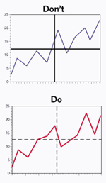 EMPHASIZE THE DATA, NOT THE FIGURE: The most prominent element of a figure should always be the essential data. That means you shouldn't bold the axis lines or borders in a line graph (top right). Instead, bold the data line (bottom, right), so that its prominence catches the eye.