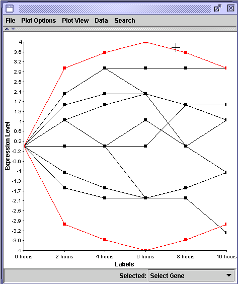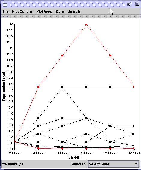 In this example, all genes began at 1 fold, or baseline levels. Two genes have been highlighted in red. Which one changes its expression the most? From the graph, it appears that the upper gene did when it was transcribed 16 times more at 6 hours than at 0 hours. The bottom red gene went from 1.0 to approximately 0.1 which appears to be a minor change in transcription.
