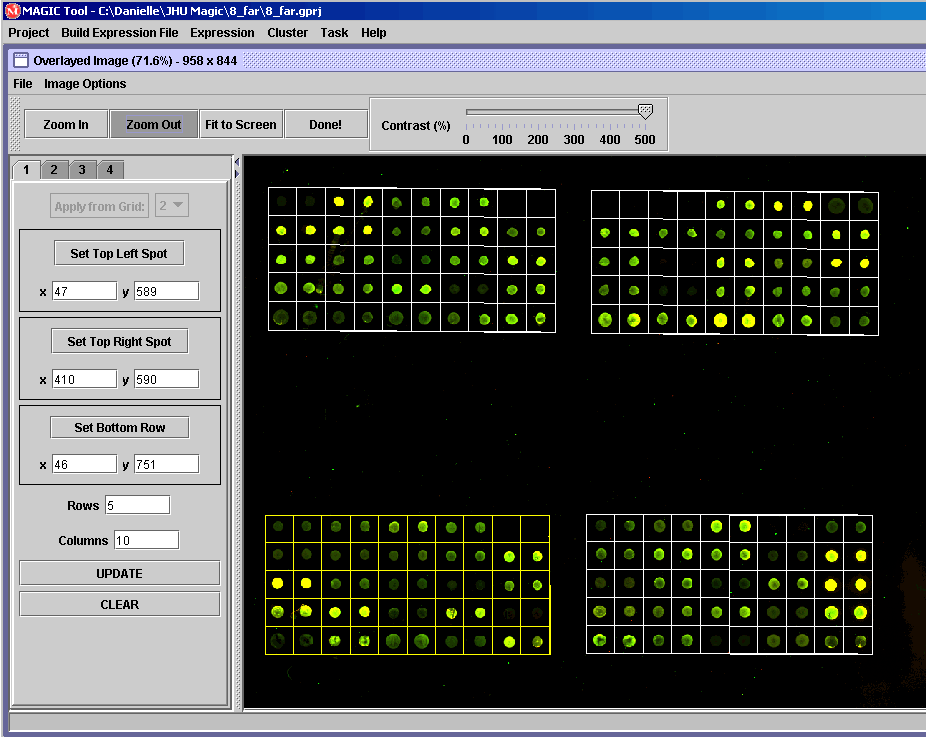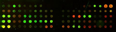 A bar code microarray is printed with the 20mer oligos from all the UpTags and DownTags, two per gene. This produces a micorarray of about 12,400 spots, two for each of the 6,200 yeast genes. The idea is to compare growth rates of all the mutant strains when they are competing against each other in the growth condition of your choice. The two tags are flanked by PCR primer sites that will amplify all the unique tags simultaneously (red primer pair amplifies all UpTags, green pimer pair amplifies all DownTags).