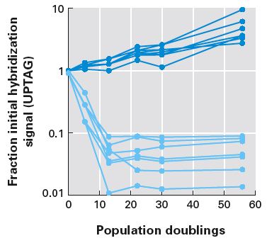 Bar code microarrays allow the investigator to determine what role, if any, a gene has for growth of yeast in a particular condition. For example, you can knock out a gene that is responsible for zinc metabolism and without which a cell cannot grow properly - let's call that strain Zn-. Strain Zn- is grown in a flask with 499 other mutants, each with a different gene knocked out and replaced by the bar code tags and selectable marker as shown below. Each tag (one unique UpTag and one unique DownTag per knock out strain) is composed of 20 bases not found in yeast.