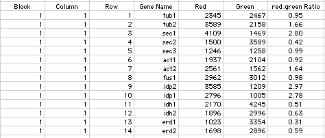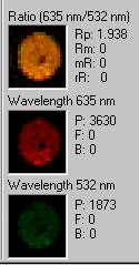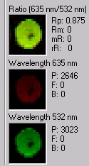 Data are collected as numerical values for each color and a red:green ratio is calculated.