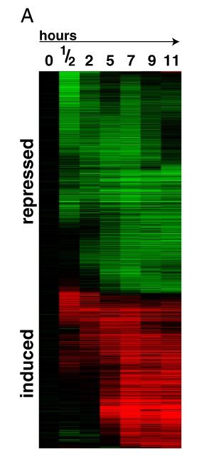 Spots that bind to both cDNAs appear yellow.