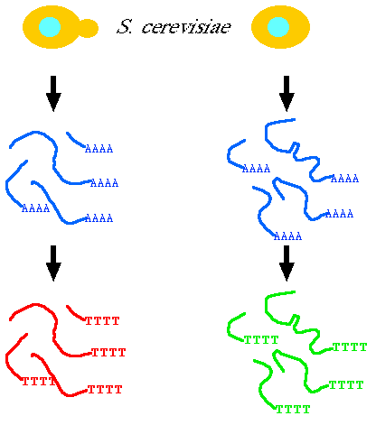 RNA is isolated from two populations of cells. Two populations of RNA are converted to two colors (red and green) of cDNA.