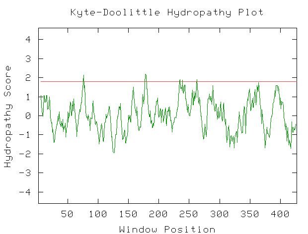 Figure 5: Kyte-Doolittle hydropathy plot for YMR187C sequence. One transmembrane domain is indicated. 2004 http://occawlonline.pearsoned.com/bookbind/pubbooks/bc_mcampbell_genomics_1/medialib/activities/kd/kyte-doolittle.htm.