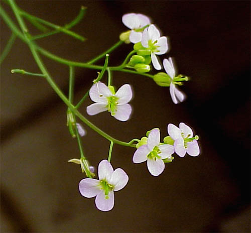 Close up of A.thaliana flowers and a close relative (A. arenosa) at far right. (photos on left courtesy Luca Comai)
