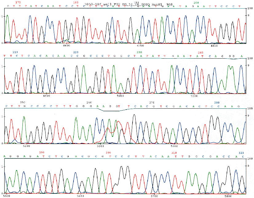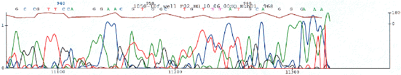 Figure 1. Sequence from an unknown piece of DNA. A cycle single sequencing reaction was loaded into the Megabase sequencer, along with 95 other sequencing reactions. This is a typical set of chromatograms from one sequencing reaction. The bases were determined by automated software. Above the bases are numbers for the bases and below the four-colored traces the numbers indicated the number of scans by the laser. Below the bases is a horizontal line which remains horizontal at the 100 level (right side of Y axis) as long as the data quality is good. When the software detects low quality data (usually due to uneven spacing of the peaks), then the line dips down towards the 0 level. The color of the line starts off as blue but turns to brown to indicate the data should not be trusted which occurs at about base 886. G is green, C is black, A is blue, and T is red.