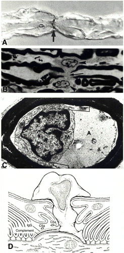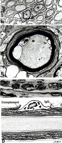 Figure 3. Immunopathology of AIDP. A) Immunostaining showing C3d surrounding two nerve fibers indicated by asterisks (*) B) Complement activation and influx of calcium along with demyelination. C) Complement-mediated activation of macrophages. D) Depiction of pathology in AIDP involving complement activation and macrophage-mediated demyelination. (Image from Ho et al., 1998. Copyright 1998 by Annual Reviews, Inc. Permission pending. )