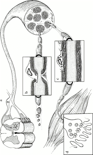 Figure 2 . Locations of GBS peripheral nerve attack in peripheral nervous system. a) Dorsal root ganglia can be the target of an antibody response in MFS. b) Nodes of Ravier are a target of immune response in AMAN. c) Schwann cell myelin surface proteins can be the target of antibody binding in AIDP. d) Neuromuscular junction (not known to be involved with GBS). (Image from Ho et al., 1998. Copyright 1998 by Annual Reviews, Inc. Permission pending.)