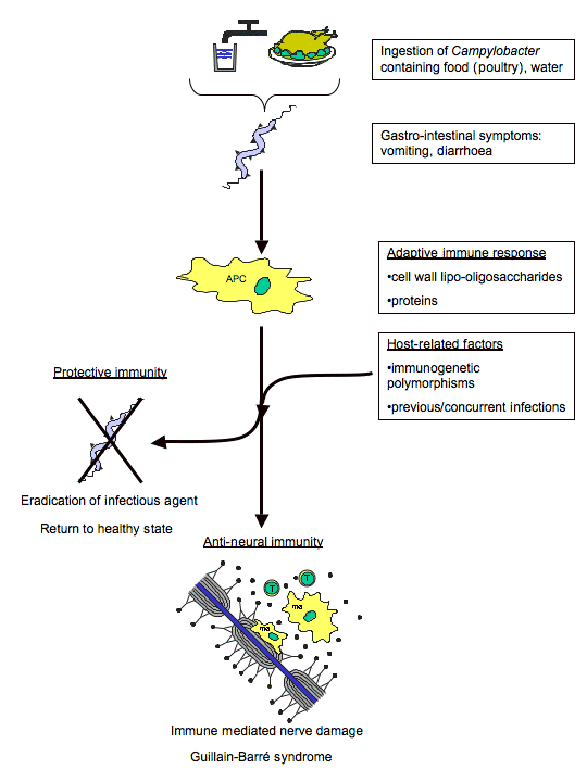 Most of the pathogens that are known to cause GBS gain entry to the body through mucosal or gut epithelium. They can enter the body by the use of multifenestrated cells or other mechanisms to cause an infection. The innate immune response results in the uptake of the pathogens by immature antigen presenting cells (APCs). After migration to lymph nodes, a mature, differentiated APC can present peptides in MHC class II molecules and activate CD4 T cells that recognize antigens from the infectious pathogen. B cells can be activated as well by newly activated Th2 cells. This produces a cell mediated and humoral response against the pathogen (Janeway, 2005). In the case of C. jejuni infection, antibodies will be produced, leading to activation of the complement system and phagocytosis of the bacteria. However, in rare cases the antibodies produced against certain C. jejuni antigens will also bind to gangliosides of the neurvous tissue causing complement activation and damage by phagocytes. This results in damage to peripheral nervous tissues, which leads to demyelination and axonal damage (Kuwabara, 2004).