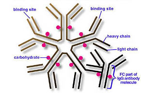 Figure 4. This is the structure of a rheumatoid factor as IgM (rheumatoid factor can also be IgG or IgA). These rhematoid factors are antibodies that bind Fc fragments of the host's IgG molecule and cause an autoimmunity response. This is shown in the bottom right of the figure. Permission pending from Doris Lefkowitz at http://glycoscience.org/glycoscience/document_viewer.wm?FILENAME=G002.