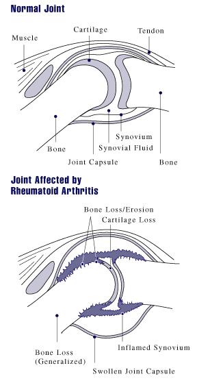 Figure 5. This is view of the difference between a normal joint and a joint affected by rheumatoid arthritis. Pay attention to the synovial fluid and how it changes in the figure from the top to the bottom. The darkened, jagged-edged mass is the inflammation caused by various factors of RA. Courtesy of Wikipedia at http://en.wikipedia.org/wiki/Image:Rheumatoid_arthritis_joint.gif.