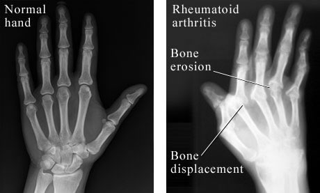 Figure 2. This image shows the contrast of an X-ray of a normal hand on the left to that of a patient with RA on the right. This inflammation, bone errosion, and bone displacement is shown in the right side of the figure. Permission pending from Paul Traughber of Intermountain Medical Imaging at http://www.webmd.com/hw/health_guide_atoz/zm6061.asp.