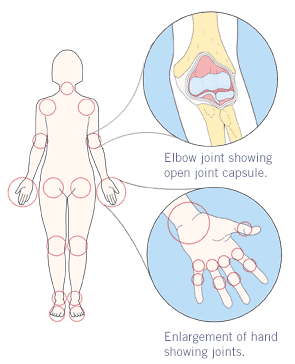 Figure 3. Rheumatoid arthritis affects many joints all over the body, which are are circled in red above. Courtesy of RA.com at http://www.ra.com/ra/rastore/cgi-bin/ProdSubEV_Cat_200635_SubCat_200635_NavRoot_303.htm?#recog.