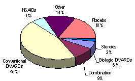Figure 6. The pie chart above is of different classes of treatment with corresponding percentages. Conventional DMARDs are used 46% of the time, NSAIDs are used 6%, Placebo is 18%, Steroids are 2%, Biological DMARDs are 6%, a combination of treatments is 9%, and other drugs constitutes for 14%. This variety of treatments is better explained below. Permission pending from http://www.metawork.com.