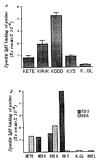 Monoclonal internal image anti-idiotype antibodies are powerful tools for the identification and characterization of the participants in a receptor-ligand interaction 17-18. Peptides containing the KDEL signal (Table 1) can be used to raise anti-KDEL antibodies that recognize this signal at the carboxy terminus of ligands. Internal image anti-idiotype antibodies 18-20 raised against these anti-KDEL antibodies should then recognize the receptor by its KDEL-binding site. We raised such anti-idiotype antibodies and demonstrate here that they recognize an intrinsic membrane protein that is a candidate for the KDEL receptor.