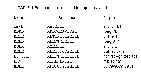 Peptides were synthesized in an automated continuous flow instrument using FMOC chemistry 29 and purified by reverse phase HPLC. The peptide KXXXXXKDEL consists of a mixture of analogues containing any one of alanine, aspartic acid, histidine, glutamine, leucine, tyrosine or lysine at each of the positions X. KDEL-terminated peptides are identified throughout by their unique amino-terminal residues. Single-letter amino-acid code used.