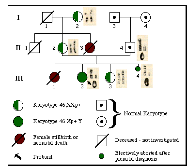Chromosome studies on a profoundly retarded girl with multiple congenital abnormalities revealed a karyotype of 46,Xp+Y in peripheral blood and skin fibroblast metaphases (Xp+ represents additional material on the short arm of the X; see Fig. 1, III-2). The Giemsa banding pattern of the abnormal X suggested duplication of the p21 and p22 bands, that is, 46,dup(X)(p21--> pter)Y. The Y chromosome was morphologically normal and indistinguishable from the Y chromosome of the father (Fig. 1, II-4) and paternal grandfather (Fig. 1, I-3). Evidently, the aberrant X chromosome was derived from the mother. The proband's maternal grandmother (Fig. 1 I-2), mother (Fig. 1, II-2), and a younger phenotypically normal sister (Fig. 1, III-3) all had a karyotype of 46,XXp+. The proband died at 5 years of age. Autopsy disclosed female internal genitalia and microscopic ovarian remnants consisting of ovarian stroma and degenerating primordial follicles. No testicular tissue was found. Complete details of the case will appear elsewhere (8).
