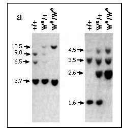 In mouse fetuses homozygous for mutations at the dominant white spotting (W) locus, testes form normally despite a lack of germ cells12-14. If Sry is to be considered a candidate for Tdy, it ought to be expressed in We/ We as well as in wild-type genital ridges. We were able to identify embryos homozygous for the We allele15 by virtue of a restriction fragment length polymorphism detected using a probe for c-kit16,17 (Fig. 3a). In PCR analyses of Sry expression in genital ridge at 11.5 d.p.c., We/We fetuses proved indistinguishable from wild type (Fig. 3b).