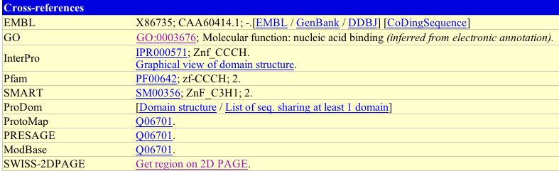 Figure 2: Image taken from swissprot database. This website lists the molecular function of LEE1 as nucleic acid binding. The database also provides links to further information on the LEE1 protein.(http://us.expasy.org/cgi-bin/niceprot.pl?Q06701)