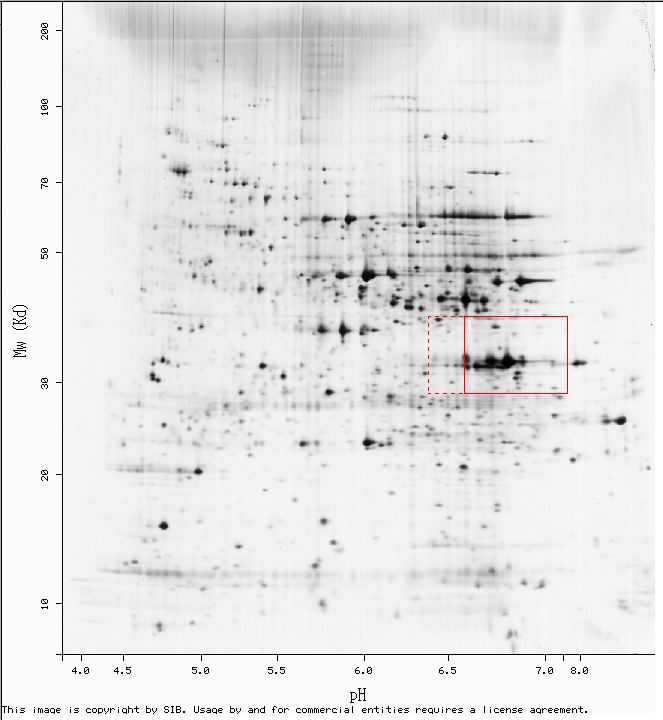 Figure 3: This image is taken from a swissprot link to expasy 2D. The red box indicates the region to which the LEE1 protein should migrate based on its molecular weight and isoelectric point. (http://us.expasy.org/cgi-bin/ch2d-compute-map?YEAST,Q06701)