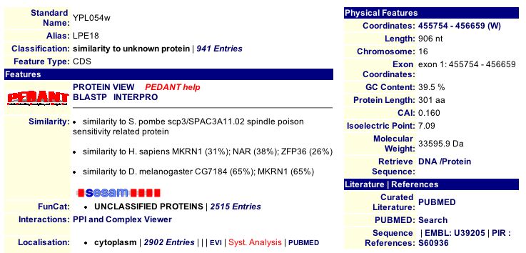 Figure 1: MIPs information regarding the unannotated yeast gene LEE1. This figure shows a molecular weight of 33595.9 Da and an isoelectric point of 7.09. The LEE1 protein has similarity to S. pombe scp3/SPAC3A11.02, H. sapiens MKRN1 and ZFP36 and D.melongaster. The amount of similarity shown in percentages next to the H. sapien and D. melongaster indicates that the sequences are not highly similar.(http://mips.gsf.de/genre/proj/yeast/searchEntryAction.do?text=YPL054w).