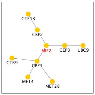 Figure 1: Screen capture of the graph generated by DIP for MIF2, which depicts the protein-protein interactions for the MIF2 encoded protein. The MIF2 protein is signified by the red node in the top left corner of the figure. MIF2 is shown to interact only with the central node, which represents the MCM21 protein. According to the Saccharomyces Genome Database, MCM21 is involved in chromsome segregation, and it also localizes in the condensed nuclear chromosome kinetechore.
