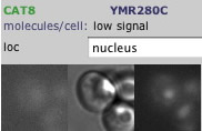 | The localization data isn't shocking - CAT8 was detected in minor amounts in both the cytoplasm and in the nucleus, which is what we might expect for a transcriptional regulator. It needs to be in the nucleus to act on the DNA, and it probably is present in the cytoplasm because a) that's where it is translated, and b) that is where it becomes functionally active. |