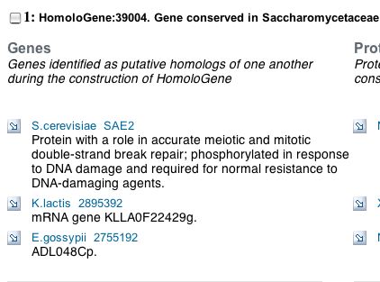 Figure 4. Sceenshot of HomoloGene search results. Perform your own search for SAE2 at the NCBI Homologene website.