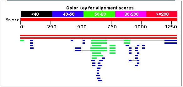 Figure 3. Pictorial representation of BLAST results from BLASTing the genomic sequence of MCA1. The picture shows that two sequences out of 57 hits produced bit scores greater than 200, shown by red lines. Other hits returned bit scores between 40 and 80, showing that their sequence homology was not as high. Data from public domain server http://www.ncbi.nlm.nih.gov/blast/. |