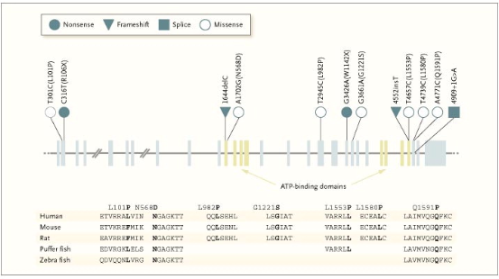 Mutations were found in 16 of the 21 infants analyzed for variations in the ABCA3 gene. Of these observed, homozygous nonsense, homozygous frameshift, heterozygous insertion and splice-site mutations all were determined as can be seen in Figure 2 from Shulenin et al. Additionally, seven missense mutations located in conserved regions of the amino acid sequence were identified while none were found in control subjects. Here the authors express reservation with the identified missense mutations because they were unable to find similar variants in the public polymorphism database. The distribution of these mutations did not favor any particular race or ethnicity suggesting that such mutations are not restricted to a single group. Also, because varying mutations were discovered in different families, no common alleles can be associated with pulmonary disorders involving surfactant dysfunction. However, the authors note that the ABCA3 gene is hormonally regulated such that genetic variants in other genes could indirectly affect ABCA3 regulation. In addition, they suggest that ABCA3 fulfills its proposed role as a candidate gene and could be involved in other pulmonary disorder involving surfactant dysfunction such as asthma and interstitial lung disease occurring later on in life.