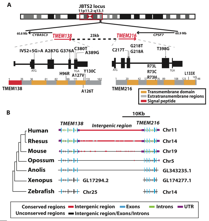 Panel B: This panel shows the conservation of TMEM138, TMEM216, and the intergenic region separating them. Conservation of both the genes and the intergenic region diminishes with evolutionary distance from humans. Of note, although the adjacency of the two genes is conserved in reptiles and mammals, the genes are not adjacent in amphibians or fish.