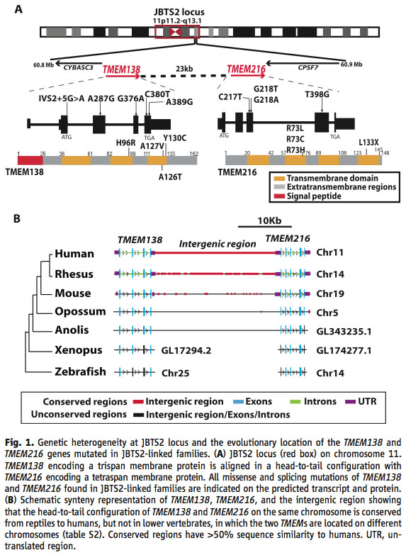 A) The first line is showing the evolutionary location of theJBTS2 locus, which represents the genes that can cause Joubert syndrome on chromosome 11. The second line shows that the genes are lined up on the chromosome in a head-to-tail configuration with a 23 kb pair noncoding intergenic region between them. The third line shows all of the identified missense and splicing mutations found in the two genes that caused a disease phenotype in the studied families. The fourth line is a diagram of the final protein, showing transmembrane domains in yellow, extratransmembrane regions in gray and signal peptides, which direct the transport of the protein in red.