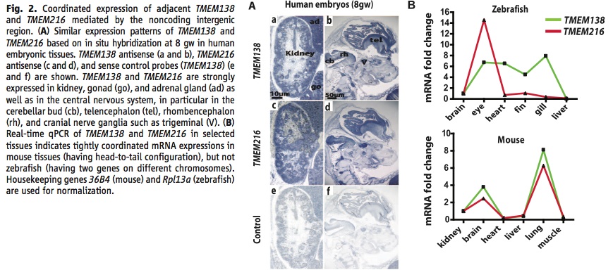 Since the genes were aligned directly next to each other, due to an ancient chromosomal rearrangement at the amphibian to reptile evolutionary transition, the researchers tested if the genes were part of a CRM and in turn, coregulated and cofunctioning. They did this by testing tissue-expression patterns in humans and mRNA levels in zebra fish versus mice. They found tight coexpression across major tissues and tight coordinated mRNA expression levels in mice compared to zebrafish, whose TMEM216 and TMEM138 are not directly adjacent. They also noted that both genes were needed for ciliogenesis and could be found tagging separate vesicles that localized to the base of cilia and contained different sets of cilia-targeted proteins. They then used siRNA to knockdown each protien in turn to test if TMEM138 and TMEM216 were required to move the vesicles containing the other. They found that TMEM216 was required for the correct movement of the TMEM138 vesicles. They found retention of the coordinated movement of TMEM216 and TMEM138 vesicles in zebrafish, which suggests that the coordinated localization preceded coordinated gene regulation. However, the two genes in zebrafish caused different phenotypes, unlike in humans, which would suggest that gene function changed to be more similar with the chromosome rearrangement.