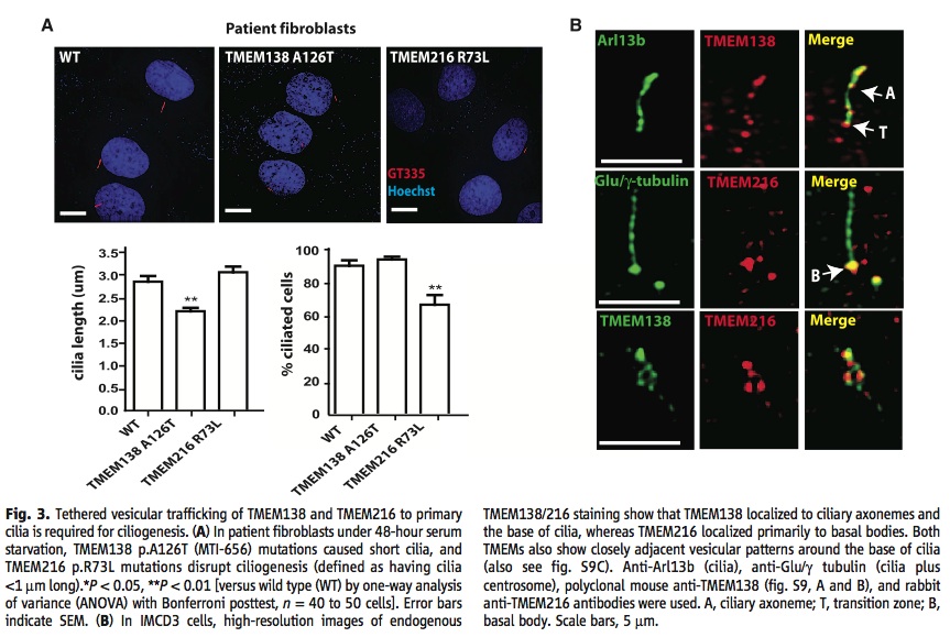 B) These images are showing where the TMEM216 and TMEM138 proteins localize in IMCD3 cells. TMEM216 localized primarily to ciliary axonemes and the base of cilia, while TMEM216 localized primarily to basal bodies. Anti-Arl13b was used to show the location of cilia and anti-Glu/γ-tubulin fluoresced the cilia and centrosome. In the image A represents ciliary axoneme, T, transition zone, and B, basal body.