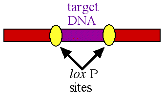 In the early 1990's a new method was developed to delete a specific portion of DNA. The procedure took advantage of the basic research performed on the bacteriophage called P1. In this virus, there is an enzyme called cre and particular DNA sequences called lox P sites. The lox P sites work in pairs and they flank a segment of DNA called a target (figure 1).