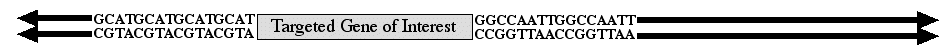 Figure 1. Diagram of gene targeted for replacement by an engineered construct. The coding sequence is illustrated by the box with flanking upstream and downstream DNA sequences provided. The arrows pointing away from the targeted gene represent the continuous chromosomal DNA.