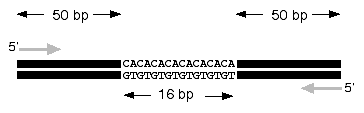 Figure 1. Detecting microsatellites from genomic DNA. Two PCR primers (forward and reverse gray arrows) are designed to flank the microsatellite region. If there were zero repeats, the PCR product would be 100 bp in length. Therefore, by determining the size of each PCR product (in this case 116 bp), you can calculate how many CA repeats are present in each microsatellite (8 CA repeats in this example).