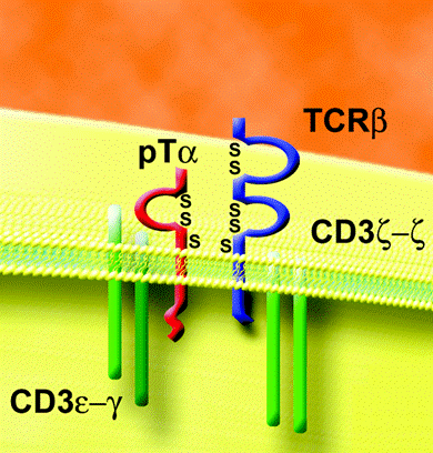 What it looks like pTα is a transmembrane protein that is approximately 33 kD long (Ramiro et al., 1996). It has a cytoplasmic tail that is 114 amino acids long specifically with a crucial COOH-terminal proline-rich sequence (Aifantis et al., 2002). pTα bonds covalently to TCRβ and noncovalently with CD3 signal-transducing molecules (Mancini et al., 1999; Borowski et al., 2004). There are two isoforms, pTαa and pTαb. pTαb doesn’t have a transmembrane section, and it may be important in retaining TCRβ in the endoplasmic reticulum to prevent its over-expression on thymocytes, which would lead to negative selection (Aifantis et al., 2002; Trop et al., 2000). For the rest of this report, pTα shall refer to the standard pTαa isoform. Figure 1:The pre-T cell receptor. The pTα is bound covalently to TCRβ, and the two are complexed with CD3 signal-transducers noncovalently. The pre-TCR is important in regulating T cell development before the final α chain can be produced. Permission given by Dr. Iannis Aifantis, image given in personal correspondence.