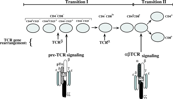 TCR expression During thymocyte development, the cell starts as a stem cell, becomes a double negative cell, then a double positive cell, then finally a single positive cell. Within the double negative stage, there are 4 substages where other surface molecules change. CD44 +CD25 - becomes CD44 +CD25 + then CD44 lowCD25 + and finally CD44 -CD25 -. It is only within the double positive stage that the TCRα replaces the pTα chain at the surface to make a complete TCR (Janeway et al., 2005; Koyasu et al., 1997). The TCRB gene is first rearranged during the CD44 lowCD25 + stage and is expressed at the surface with pTα. This expression causes the phosphorylation of RAG-2, which prevents it from rearranging the TCRB locus any more. Also, it is thought that the pre-TCR activates the Src kinase which leads to cell proliferation and expression of CD4 and CD8. During proliferation, there is no TCRA gene rearrangement. After proliferation and the expression of both CD4 and CD8, the machinery for TCRA rearrangement is activated again, specifically RAG-1 and RAG-2. TCRα replaces pTα on the surface to make complete TCRs which are used during selection (Janeway et al., 2005). Figure 2: The final T cell receptor (TCR). Note that TCRα has replaced pTα. It has a drastically shorter cytoplasmic tail, implying that it does not directly transduce signals. Permission given by Dr. Iannis Aifantis, image given in personal correspondence.
