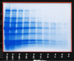 This figure has from 3,000 ng (far left lane) to 8 ng (far right lane) loaded in the lanes. The protein has been stained with coomassie blue and was produce by Pierce.