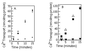 Calcium Uptake Assay - 5.0 ml of the reaction mixture (20 mM MOPS, pH 7.0, 60 mM KCl, 5 mM MgCl2, 5 mM sodium oxalate, 0.2 mM EGTA, 0.2 mM CaCl2 (with 0.4 µCi/ml 45Ca2+) and 10 µg/ml microsomal protein) was equilibrated at 25° C for 5 min before 2.5 mM ATP was added at time zero. 1.0-ml aliquots were removed at timed intervals, filtered (0.45 µm pore size; Millipore), and washed with 12 ml of 10 mM MOPS (pH 7.0), 2 mM LaCl3. A liquid scintillation counter was used to determine amounts of 45Ca2+ on the filter. For thapsigargin (Bethesda Research Laboratories) inhibition, 20 nM thapsigargin was present during the 5-min incubation period. The difference between Fig. 3A and Fig. 3B in the nanomoles of Ca2+ transported per mg of total microsomal protein is probably a result of variations in transfection efficiency and/or protein accumulation.