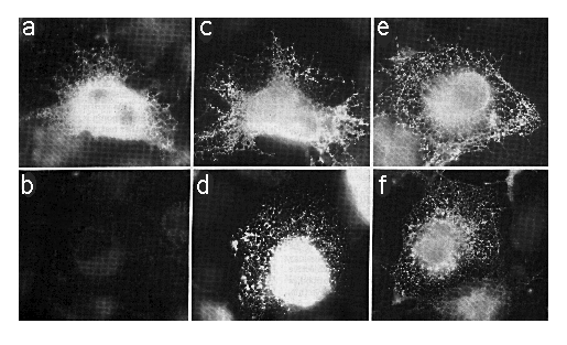 FIG. 4. Immunofluorescence photomicrographs of COS-1 cells transfected with cDNA encoding SERCA2a-myc (panels a, c, and e) or SERCA2b-myc (panels b, d, and f). Panels a and b were permeabilized with SLO alone and stained with mAb 9E10. Panels c and d were stained with mAb 9E10 after permeabilization with SLO and saponin. Panels e and f were permeabilized with SLO alone and stained with mAb 3H2. The exposure time for panel B was identical to that of panel A. All photomicrographs were taken with the x 63 objective lens and printed to the same magnification.