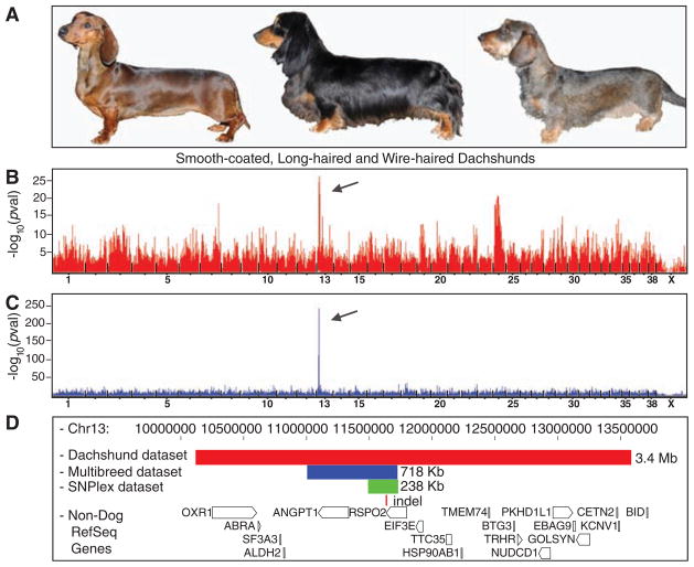 Researchers began by searching for the gene responsible for coat furnishings (the presence of growth around the moustache and eyebrows).  A dachshund SNP database was used in this analysis with smooth-coated and long-haired varieties representing controls (they have no furnishings) and wire-haired dogs as cases (they have furnishings; dachshund phenotypes shown in Fig. 1A).  Analysis within this dachshund dataset revealed strong linkage on canine chromosome 13 (Fig. 1B, the linked locus as identified by the best lod score is indicated with an arrow; associated haplotype region indicated by the red rectangle in Fig. 1D), and the CanMap database revealed linkage within the same region (Fig. 1C; associated haplotype region indicated by the blue rectangle in Fig. 1D).  Fine mapping narrowed the search to a 238 kb region (Fig. 1D, green rectangle) that overlapped with only one gene, RSPO2, which encodes R-spondin-2.  This gene likely contributes to hair furnishings because of its interactions with another gene,Wnt, that is involved in the establishment of hair follicles.  Interestingly, the mutation identified in RSPO2 was not located in the coding region of the gene, but was found to be a 167 bp insertion event in the gene's 3’ untranslated region (UTR; shown in Fig. 1D as the small red line labeled "indel").  While the insertion event does not result in changes to the R-spondin-2 protein sequence, the researchers found that changes to the 3’ UTR affect mRNA stability, and dogs with furnishings showed a threefold increase in RSPO2 transcript expression relative to controls.  Dogs that were either homozygous or heterozygous for the 3’ UTR insertion event were found to have furnishings, indicating a dominant mode of inheritance for this trait.